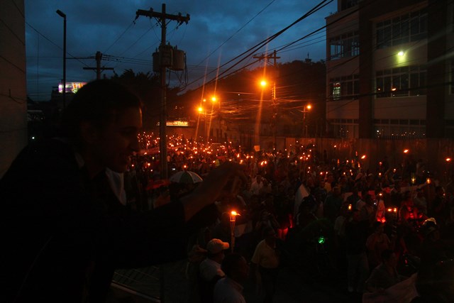 Con consignas “fuera JOH (Siglas de Juan Orlando Hernández)”, los protestantes marcharon varios kilómetros, a pesar la lluvia que cayó anoche sobre la capital de Honduras.