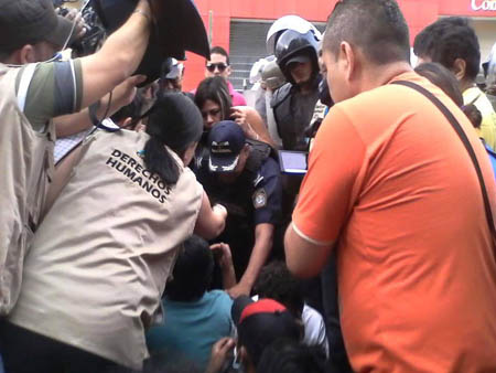 Al haber avanzado unos 50 metros, fueron detenidos por el cordón policial y militar, quienes comenzaron a golpear a los manifestantes con objetos romos; varios de ellos resultaron afectados, ya que se encuentran débiles por la huelga de hambre que cumple hoy 23 días.