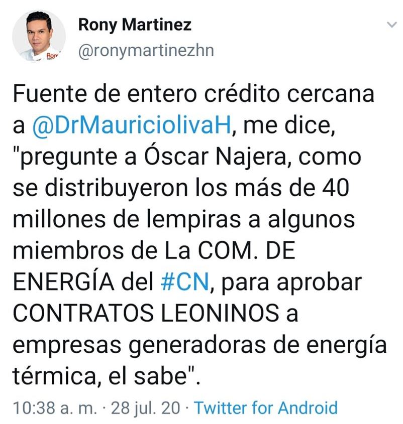 El periodista de UNE TV y diputado de Libre, Rony Martínez, informó que no se va a retractar por la denuncia que lanzó exponiendo actos de corrupción de la Comisión de Energía del Congreso Nacional, a pesar que el diputado Óscar Nájera le ha amenazado con llevarlo ante los tribunales para que éste sea inhabilitado en el canal y en su curul del Congreso.