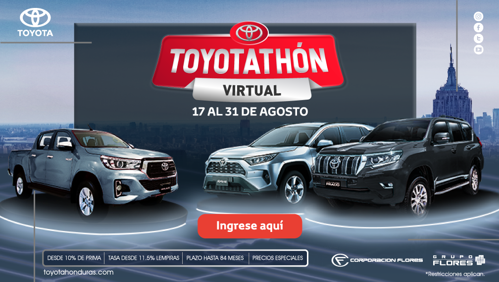 Tegucigalpa. Una oportunidad única para los hondureños. Eso es la feria virtual más esperada del año de la Corporación Flores: ¡el Toyotathón Virtual! Del 17 al 31 de agosto, usted puede adquirir el Toyota de sus sueños, a precios increíbles y excelentes condiciones de financiamiento.