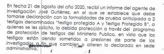 Y afirma que a estos testigos “se les solicitó la debida protección a través del Programa de Protección de Testigos del Ministerio Público, en vista de que los testigos están siendo sometidos a presiones de parte de los investigados a fin que cambien o alteren lo declarado en sede administrativa”.