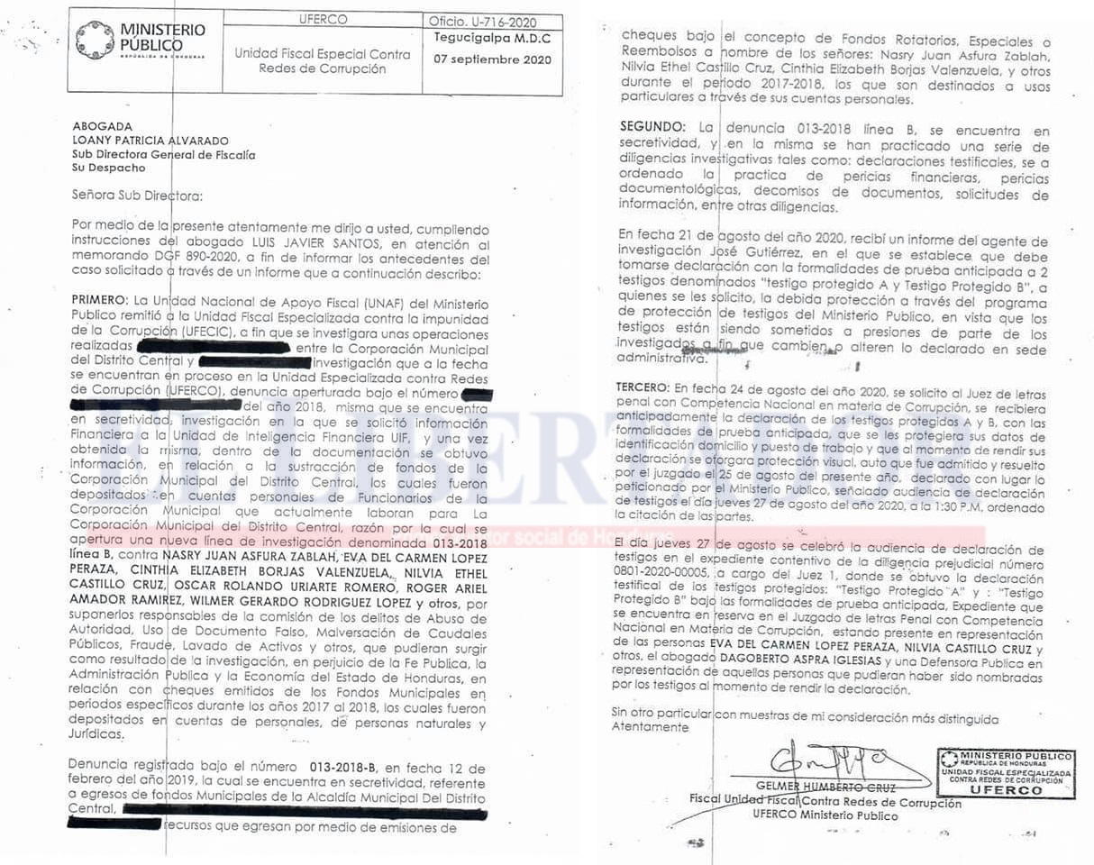 Los detalles de la investigación están contenidos en el oficio U-716-2020 de fecha 7 de septiembre de 2020, por medio del cual el Fiscal de la Uferco, Gelmer Humberto Cruz, explica a la subdirectora general de la Fiscalía, Lohani Patricia Alvarado, que la acción “se da cumpliendo instrucciones del director de la Uferco, Luis Javier Santos, y en atención a memorando DGF 890-2020”.