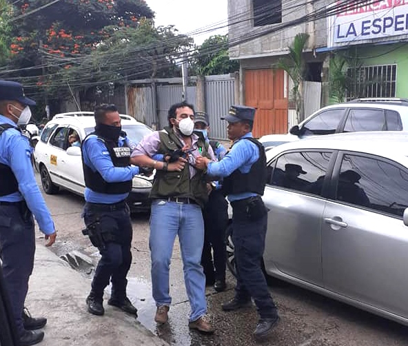 Tegucigalpa. Hace una hora, el Comité por la Libre Expresión (C-Libre), ha advertido sobre la violenta detención de los periodistas Cesario Padilla y Miriam Elvir, ambos de C-Libre, mientras ejercían labores periodísticas. En un vídeo, Padilla ha registrado la detención de la colega Elvir y acto seguido, los miembros de la Policía Nacional preceden también a arrestarlo.