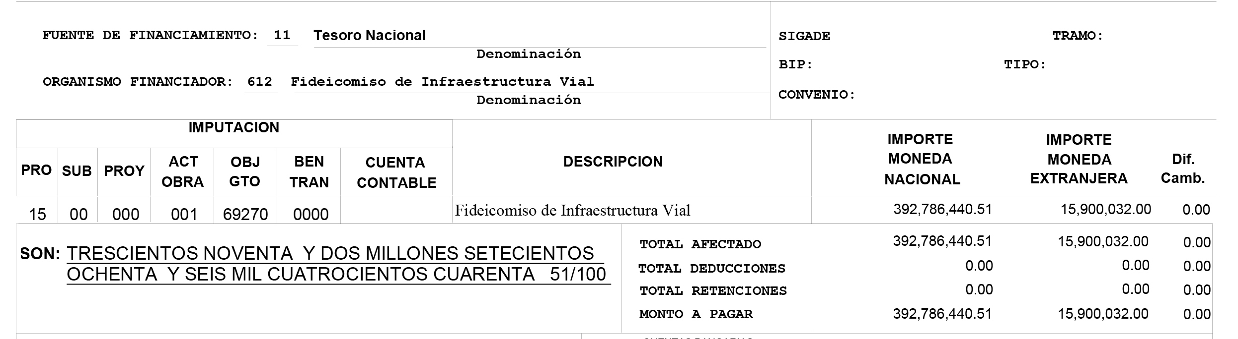 De acuerdo con la ejecución de gastos R_EGA_F01F07, de fecha 20 de marzo de 2020, el organismo financiador de los sobrevalorados “hospitales” es el Fideicomiso de Infraestructura Vial, y la transacción se consumó el 18 de marzo mediante el documento de precompromiso 00365, cuando supuestamente la especialista financiero Rodríguez verificó la información presentada por Elmed Medical Systems, a las a las 2:46 de la tarde con 36 segundos.