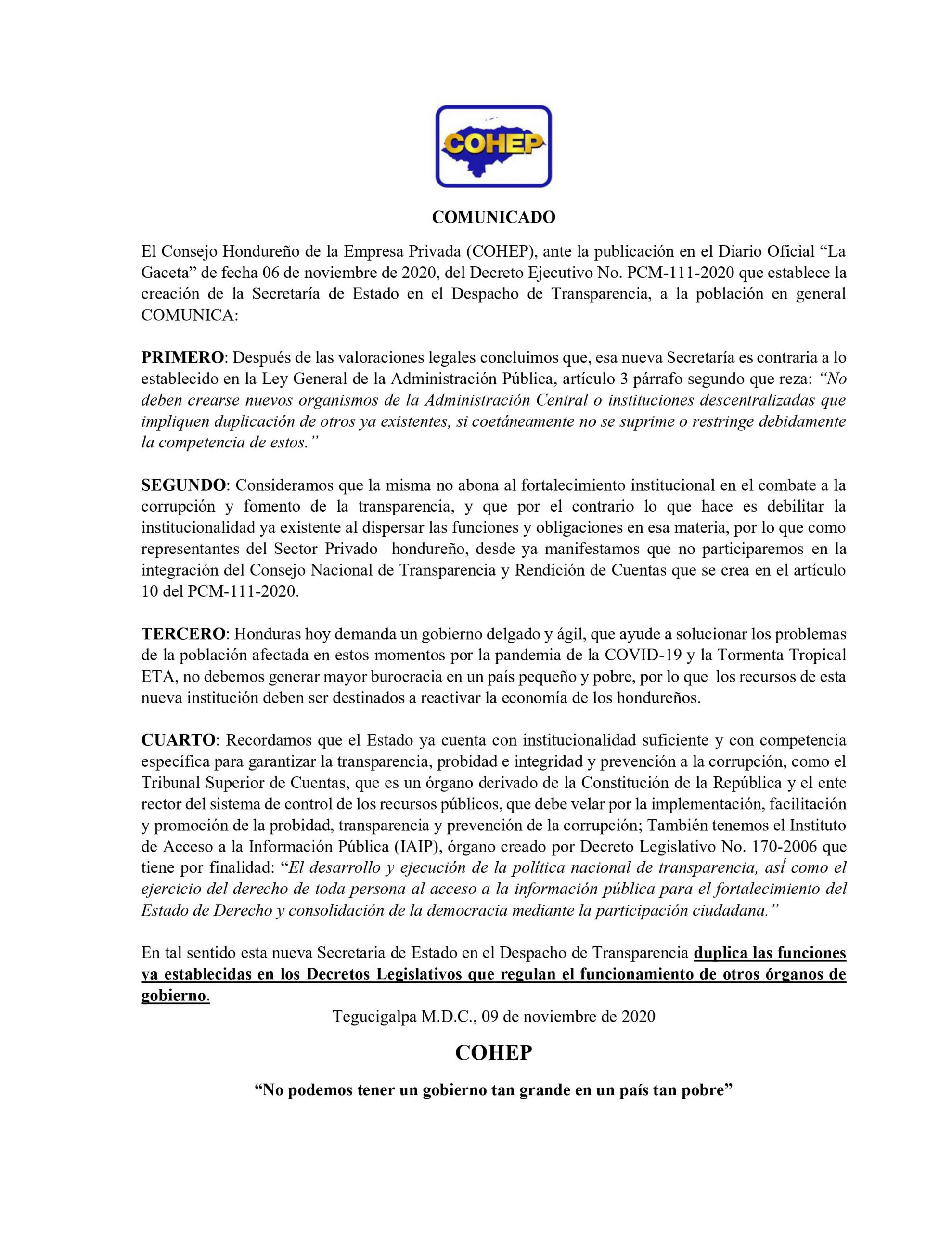 Y prosigue: “Como representantes del Sector Privado hondureño, desde ya manifestamos que no participaremos en la integración del Consejo Nacional de Transparencia y Rendición de Cuentas que se crea en el artículo 10 del PCM-111-2020”.