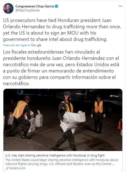 “Los fiscales estadounidenses han vinculado al presidente hondureño Juan Orlando Hernández con el narcotráfico más de una vez, pero Estados Unidos está a punto de firmar un memorando de entendimiento con su gobierno para compartir información sobre el narcotráfico”, dijo el congresista demócrata, Jesús García.