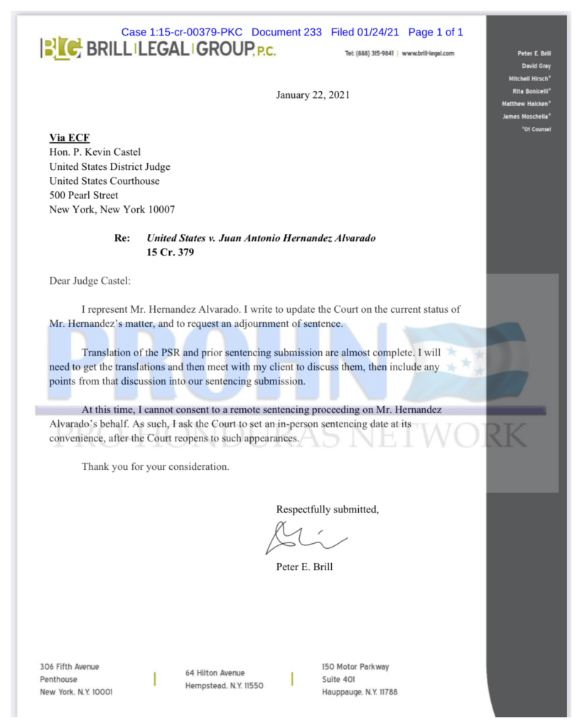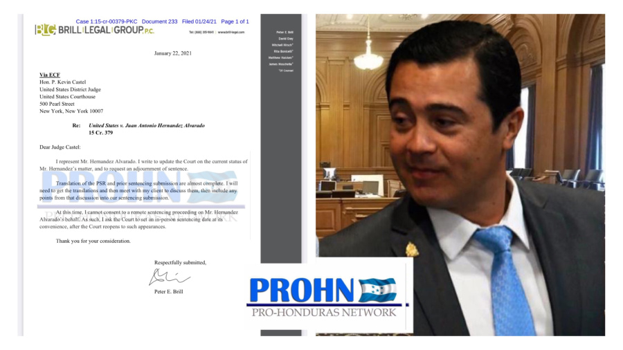 Tegucigalpa. El portal informativo, Pro Honduras Network, el abogado defensor Peter E. Brill, defensor de Juan Antonio “Tony” Hernández, solicitó a la Corte del Distrito Sur de New York, una nueva reprogramación para la fecha en que se le fijará la sentencia por los cuatro delitos vinculantes al narcotráfico en los que fue encontrado culpable en octubre de 2019.