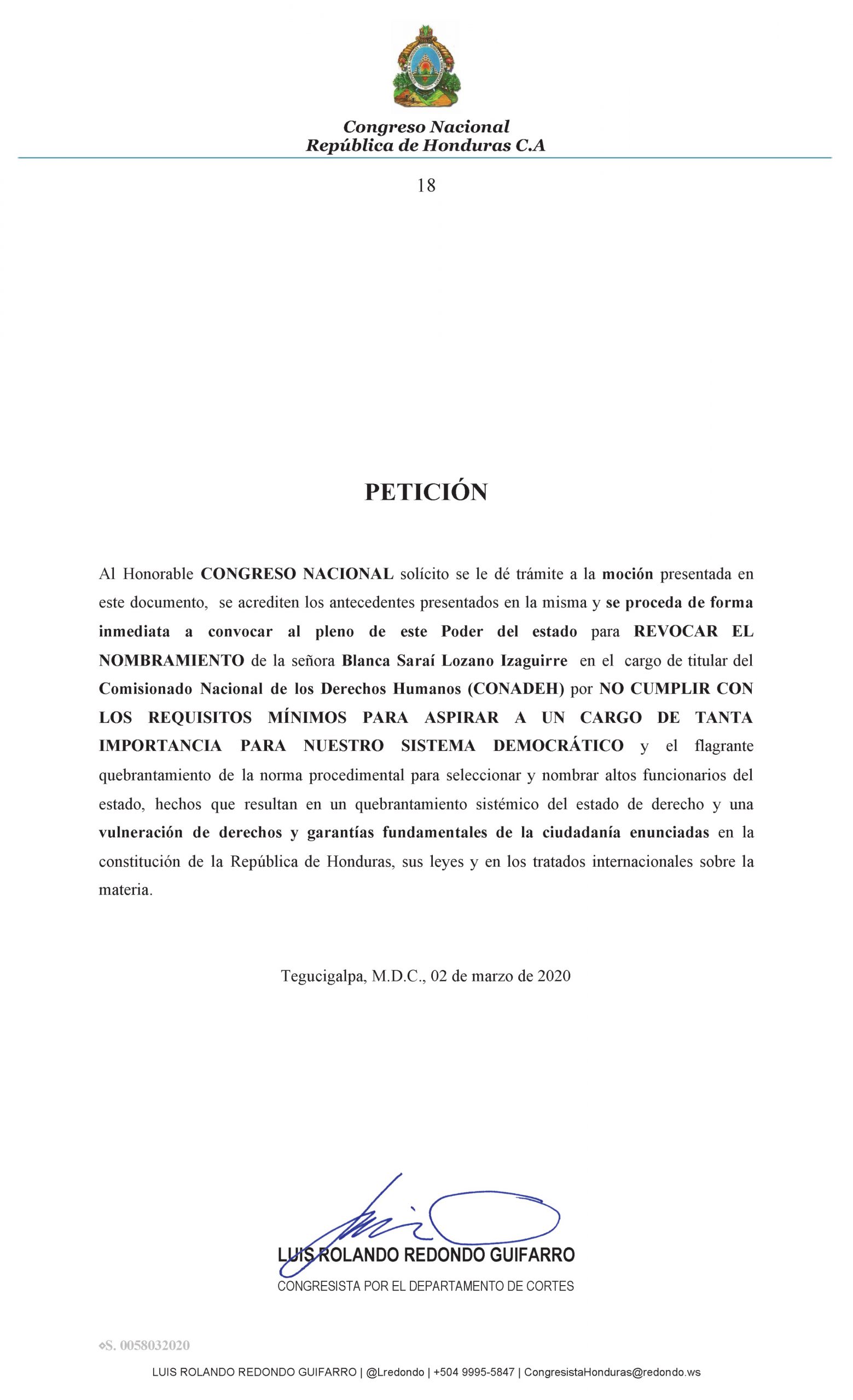 Tegucigalpa. EL diputado del Partido Innovación y Unidad (Pinu), Luis Redondo, ha publicado en su cuenta oficial de Twitter, una petición para que el Congreso Nacional, mediante una acción legislativa, revoque a Blanca Saraí Izaguirre Lozano como titular del Comisionado Nacional de los Derechos Humanos (Conadeh).