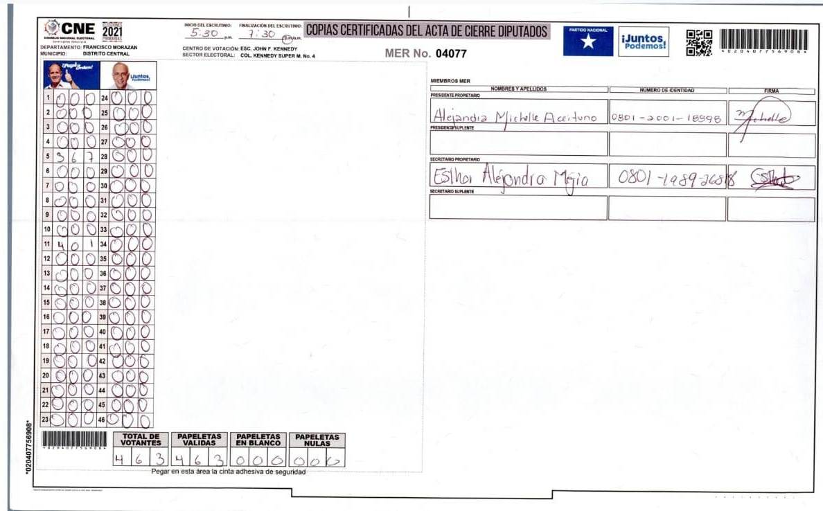 Por otro lado, el liberal, Enrique Ortez, que fue magistrado del extinto Tribunal Supremo Electoral (TSE), y a compartido en su cuenta de Twitter un acta referente a la mesa a una urna de Lempira cuya capacidad es de 500 electores, pero se registra 2,050 votos: 2,000 para Rosenthal, 25 para Darío Banegas y 25 para Luis Zelaya.