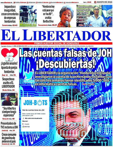 Foto principal, en agosto de 2016, Periódico EL LIBERTADOR publicó una investigación en la que demostró el uso de cuentas falsas (bots) de Juan Hernández para presentarse como persona de prestigio, exitoso en su gestión y aplaudido en los programas de gobierno que han dañado a la sociedad hondureña.