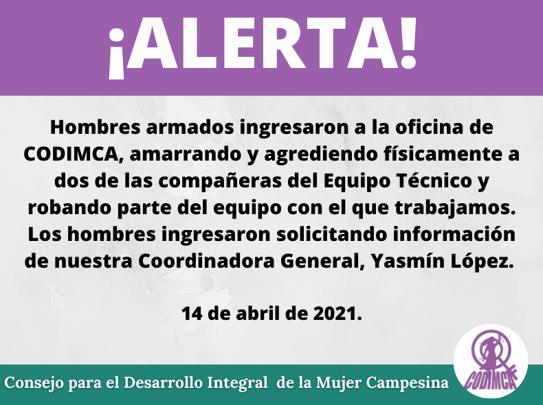 Este miércoles la organización de mujeres campesinas CODIMCA, ha denunciado que hombres armados irrumpieron en sus oficinas saqueando y torturando al personal que allí trabaja, según denuncian, los sujetos exigieron información sobre la coordinadora Yasmín López (foto) y al ser denegada procedieron con la agresión física.