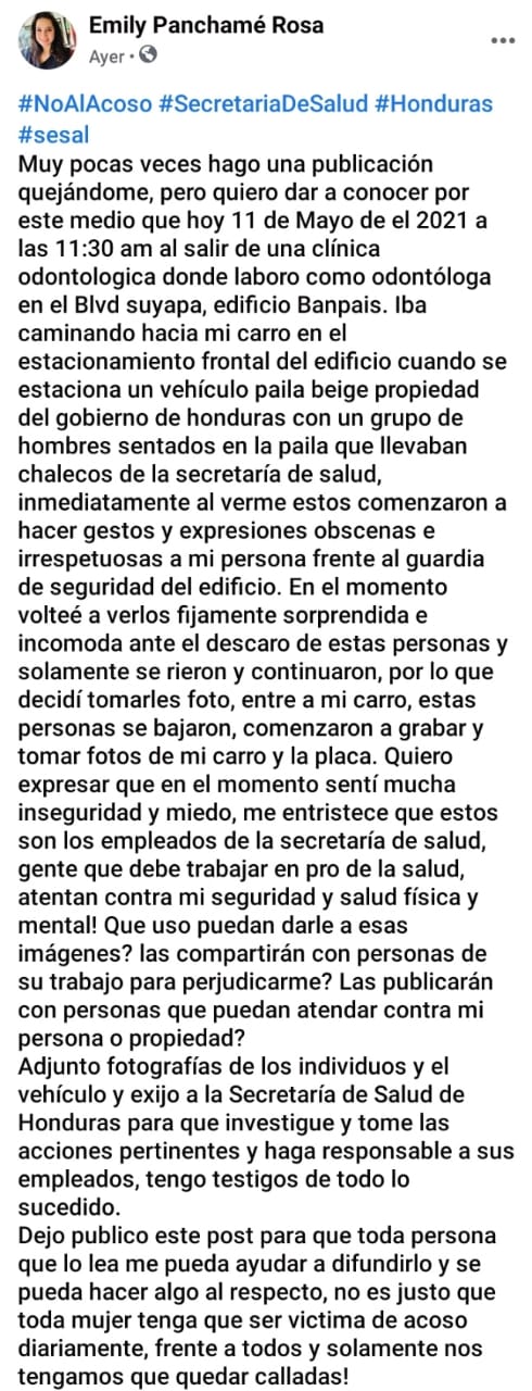 Tegucigalpa.- La odontóloga, Emily Panchamé Rosa, denunció ayer a través de una publicación en Facebook, que fue víctima de acoso verbal, sexual e intimidación por parte de empleados de la Secretaria de Salud (Sesal), quienes infirieron comentarios obscenos cuando salía de la clínica en la que labora ubicada en el bulevar Suyapa de Tegucigalpa, capital de Honduras.