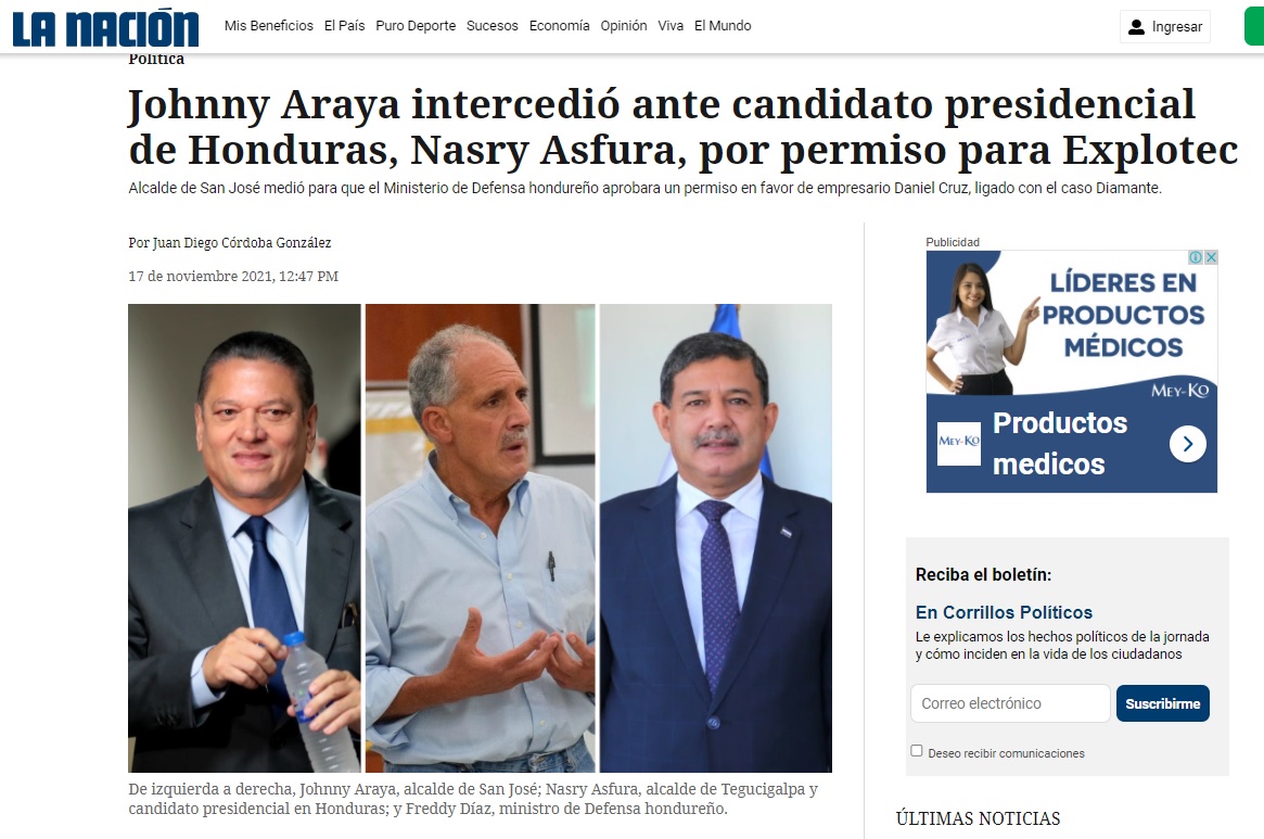 Documentos a los que accesó la agencia internacional de noticias, AFP, ha demostrado el nexo del aspirante presidencial del gobernante Partido Nacional, Nasry Asfura, en el sonado caso de corrupción “Diamante”, contra el alcalde Johnny Araya de San José, Costa Rica, reporte confirmado por el diario La Nación, de ese país.