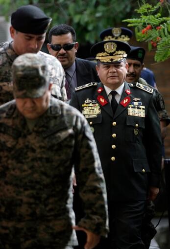 Romeo Vásquez estrechando la mano del dictador Micheletti tras el golpe de Estado en 2009.