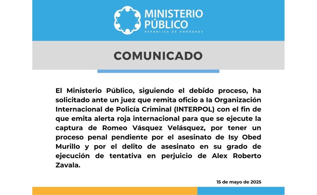 Tegucigalpa. El Ministerio Público (MP) informó que ha solicitado ante un juez que remita un oficio a la Organización de la Policía Criminal (Interpol) para que, de manera urgente, se emita una alerta roja internacional contra el ex jefe del Estado Mayor Conjunto, Romeo Vázquez, prófugo desde marzo de 2025.