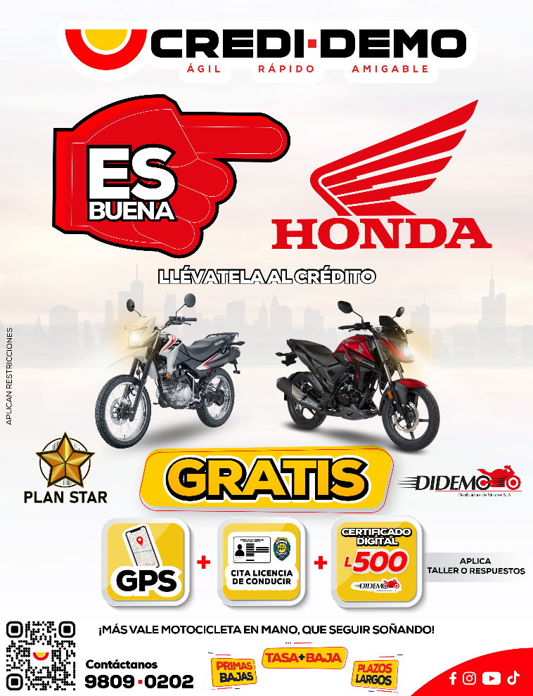 La reconocida empresa financiera, CREDI-DEMO, tiene buenas noticias para hondureños, a través de su “Plan Star” y su alianza con Didemo –distribuidor autorizado de Honda–, los clientes podrán adquirir su motocicleta al crédito con más beneficios: sistema GPS, cita para licencia y certificado de 500 lempiras para taller o repuestos.