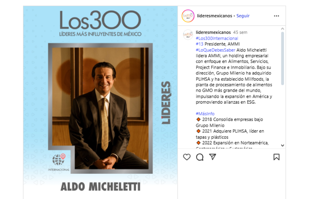 La cuenta en Instagram del ranking “lideresmexicanos” presenta al hondureño, CEO Aldo Micheletti, entre los 300 empresarios más importantes de la economía mexicana: “#Los300Internacional #13 Presidente, AMMI. #LoQueDebesSaber Aldo Micheletti lidera AMMI, un holding empresarial con enfoque en Alimentos, Servicios, Project Finance e Inmobiliario.