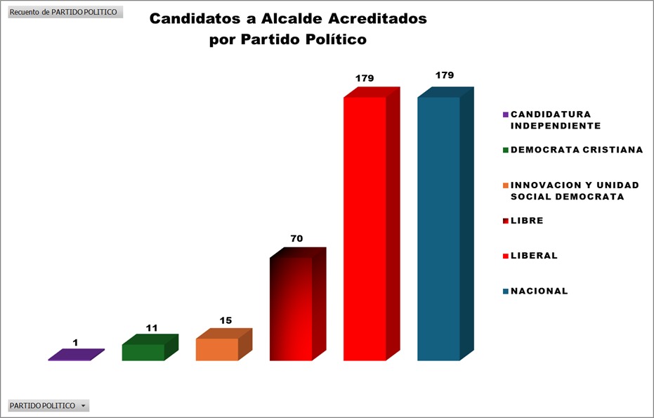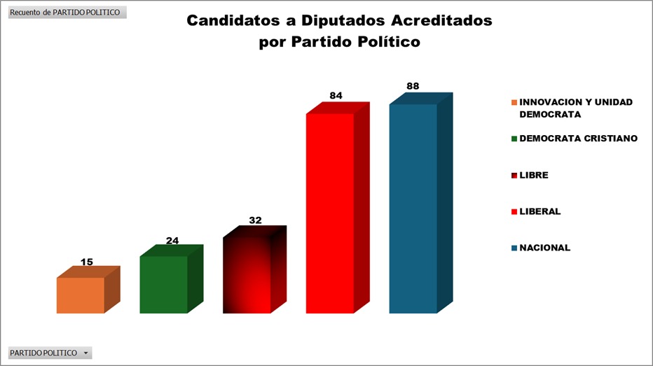 De los 703 acreditados, el 38.12 por ciento corresponde al Partido Nacional, el 37.55 al Partido Liberal, el 14.65 por ciento a Libertad y Refundación (Libre), un 5.12 por ciento a la Democracia Cristiana y el 4.41 por ciento al Partido Innovación y Unidad.