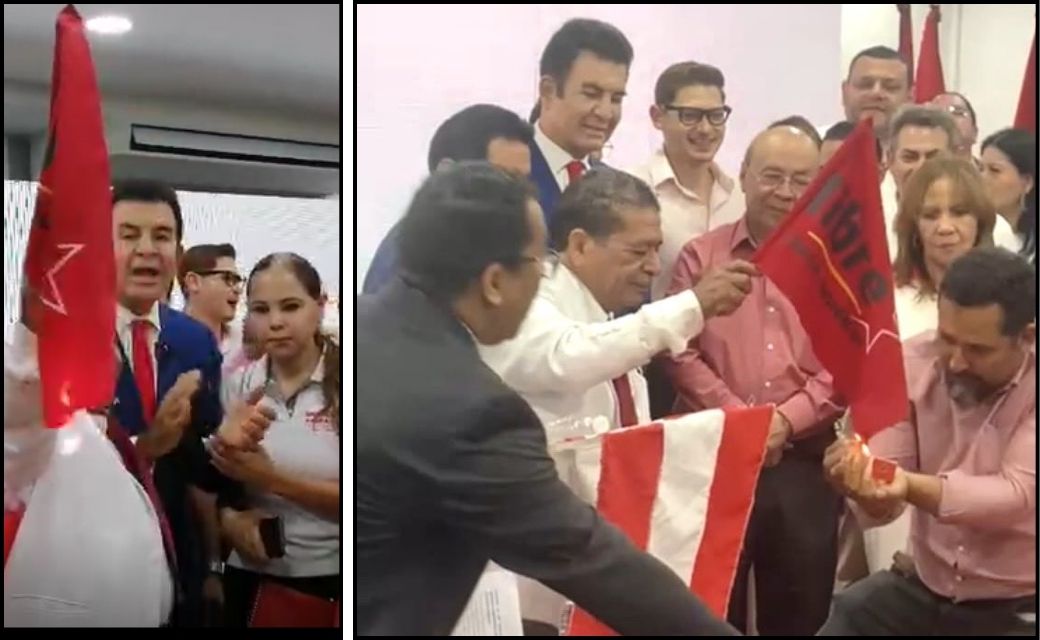 Hoy, en la sede del Partido Liberal, mientras su candidato presidencial y su candidato a la alcaldía estaban presentes, quemaron la bandera de LIBRE.