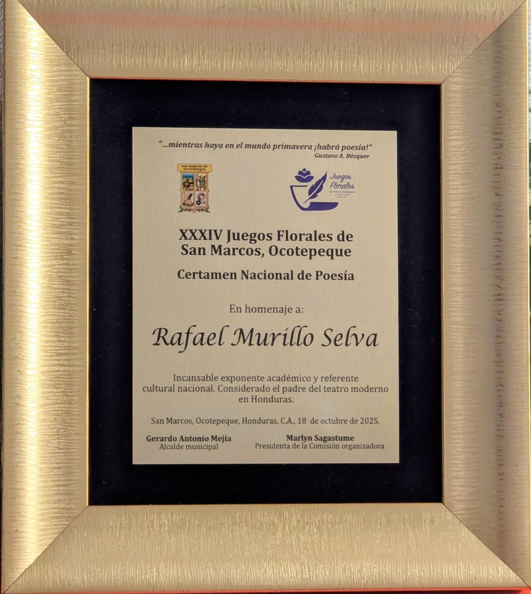 El doctor Rafael Murillo Selva, dramaturgo, académico y figura esencial del arte hondureño, fue homenajeado en la XXXIV edición de los Juegos Florales de San Marcos de Ocotepeque, un certamen que celebró su legado como pionero del teatro moderno y defensor incansable de la cultura nacional.