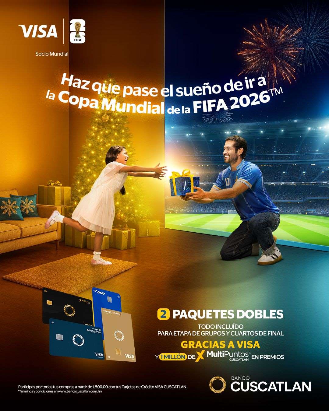 La Navidad CUSCATLAN, una de las épocas más esperadas por los clientes del banco, llega nuevamente para cumplir sueños y compartir momentos inolvidables. Este año, Banco CUSCATLAN y VISA presentan una promoción única que combina la magia de la Navidad con la emoción del fútbol, brindando a sus clientes la oportunidad de vivir la Copa Mundial de la FIFA 2026™.