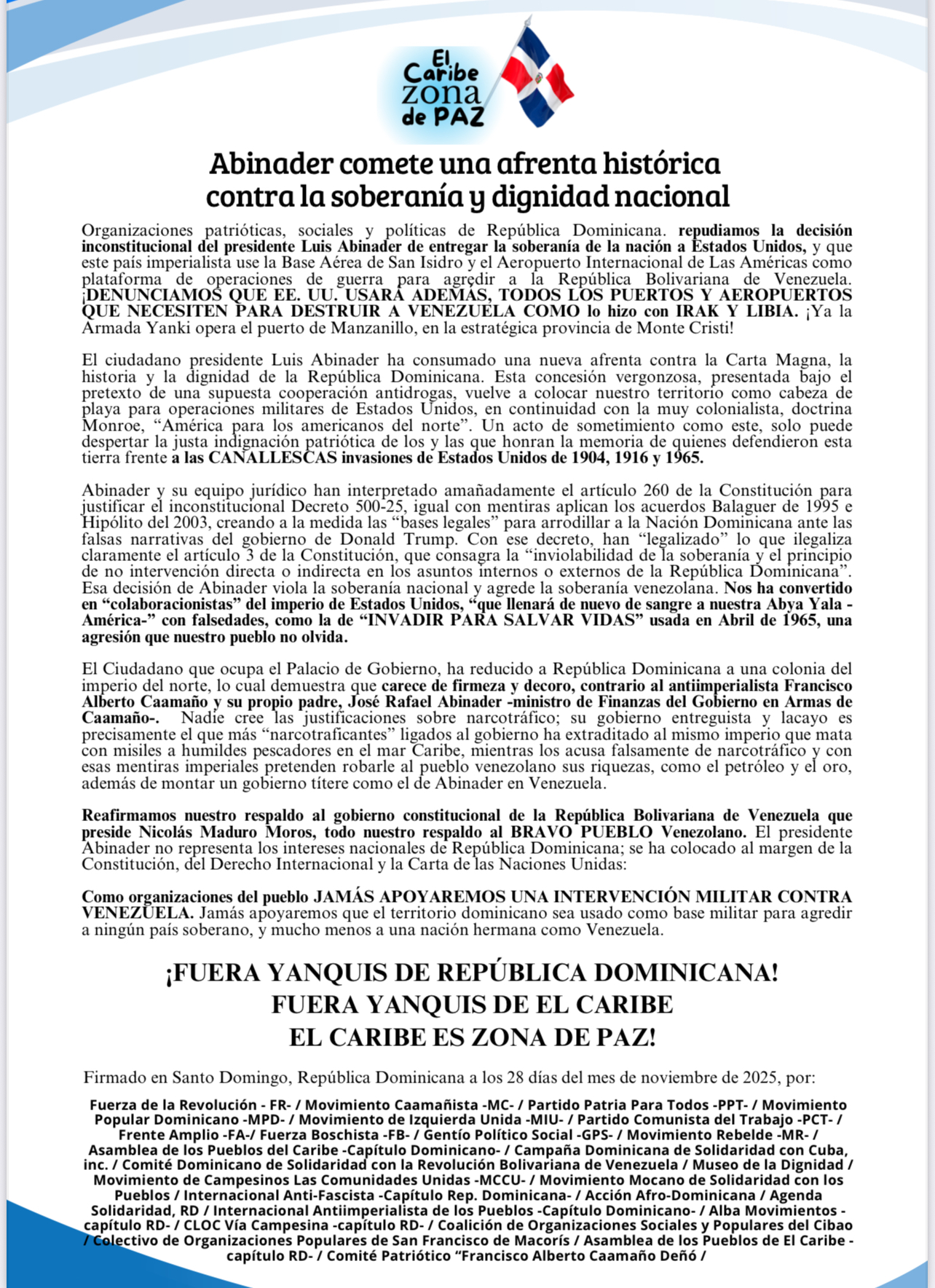 «Esta concesión vergonzosa, presentada bajo el pretexto de una supuesta cooperación antidrogas, vuelve a colocar nuestro territorio como cabeza de playa para operaciones militares de Estados Unidos», señalaron organizaciones populares de la República Dominicana, rechazando que su territorio se use con fines militares contra Venezuela.