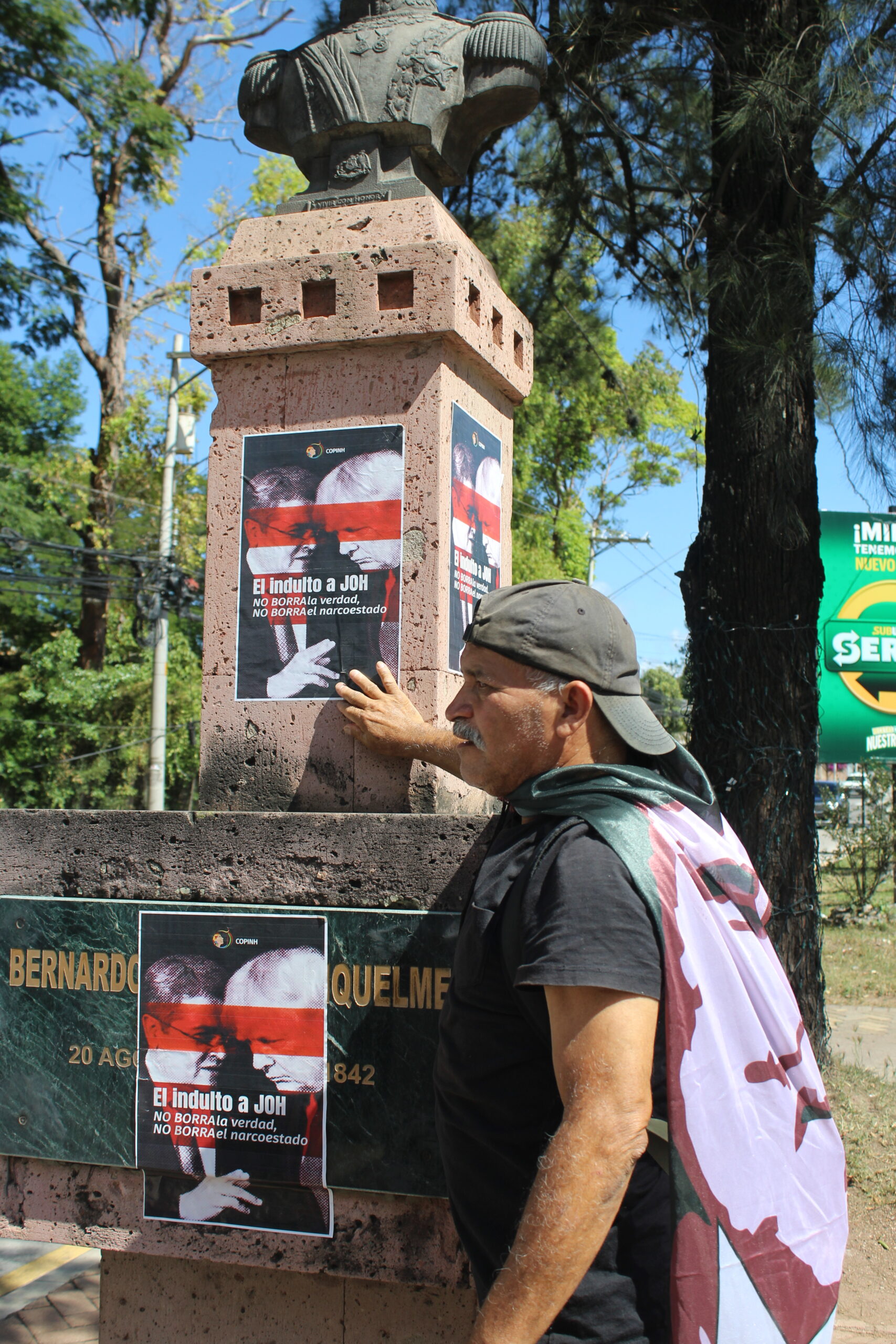 Colocaron panfletos alrededor de la embajada con la frase «El indulto a JOH no borra la verdad, no borra el narcoestado”. Con esta acción, acusaron al presidente Trump de intervenir en el país e imponer a un gobernante.