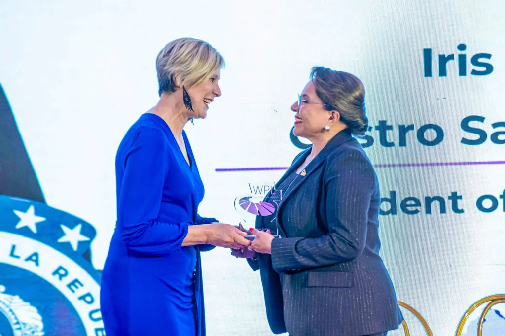 La presidenta de Honduras, Xiomara Castro, siendo galardonada con el premio “Pioneras en Liderazgo Político Femenino” durante la Cumbre Mujeres Líderes Políticas 2025, celebrada en la ciudad de Podgorica, Montenegro.