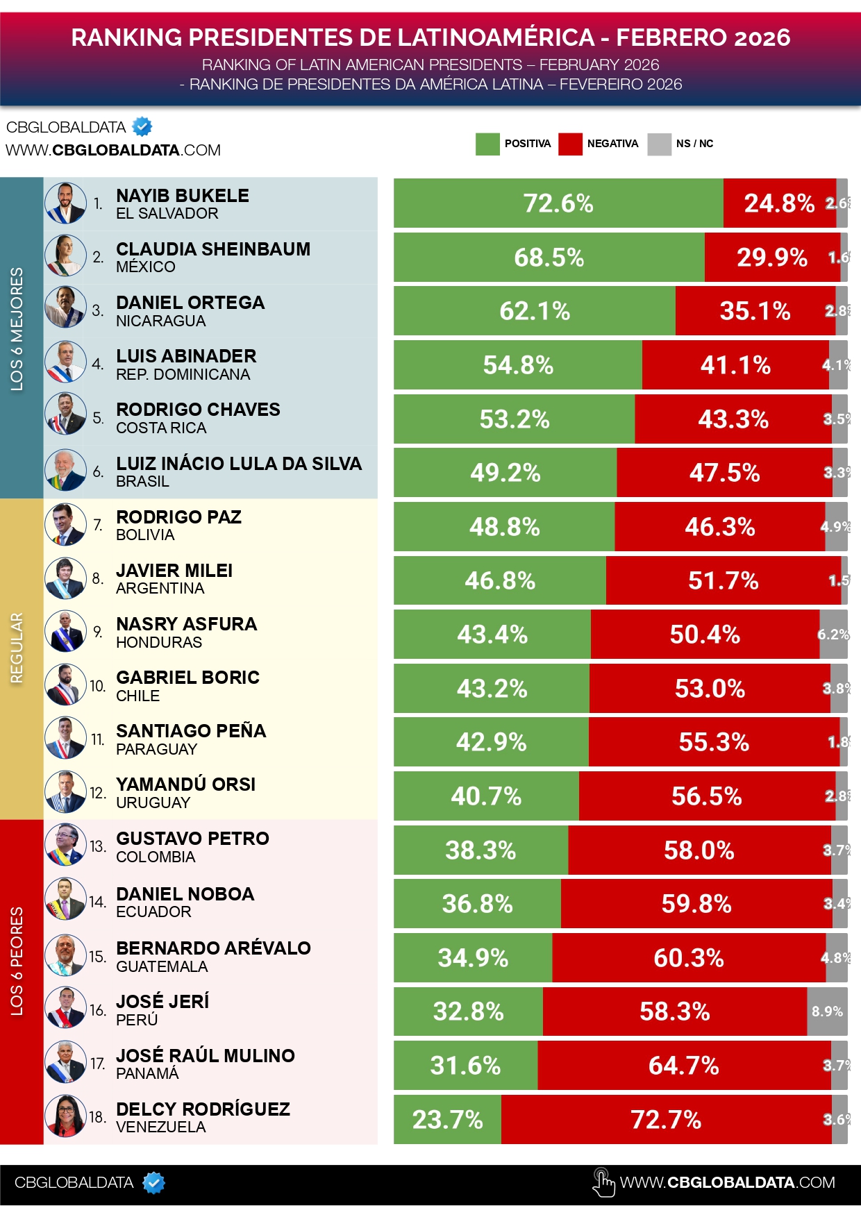 Por encima de Asfura se sitúan el presidente de Argentina, Javier Milei, con una aprobación del 46.8 por ciento; le sigue el boliviano Rodrigo Paz, con un 48.8 por ciento, y Luiz Inácio Lula da Silva, líder de Brasil, que tiene un 49.2 por ciento de imagen positiva.