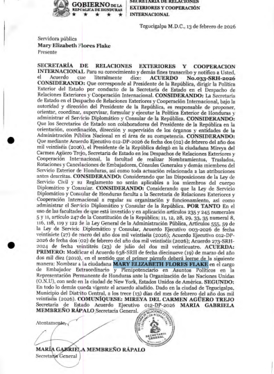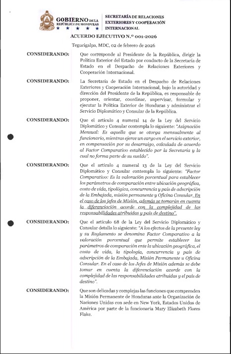 En el documento oficial, el Ejecutivo justifica la medida al señalar que las funciones en la Misión Permanente de Honduras ante la Organización de las Naciones Unidas son “delicadas y complejas”, especialmente por la dinámica internacional en Nueva York.