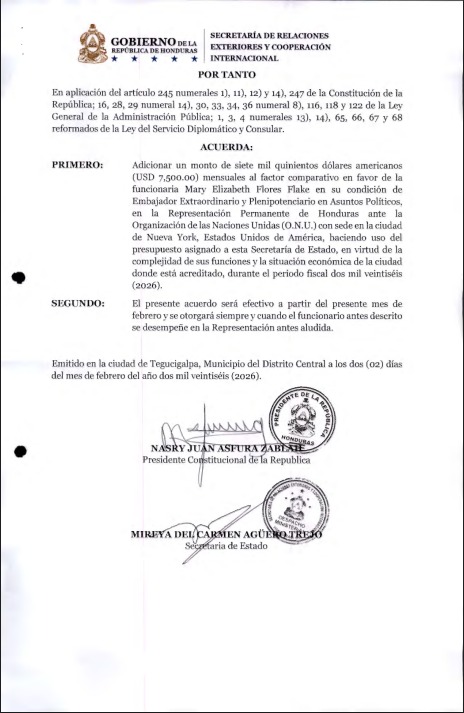 Tegucigalpa. El gobierno aprobó un aumento mensual de 7,500 dólares —equivalentes a más de 198 mil lempiras— a la embajadora ante la ONU, Mary Elizabeth Flores Flake, hija del expresidente Carlos Flores (1998-2002), mediante acuerdo ejecutivo emitido en febrero de 2026.