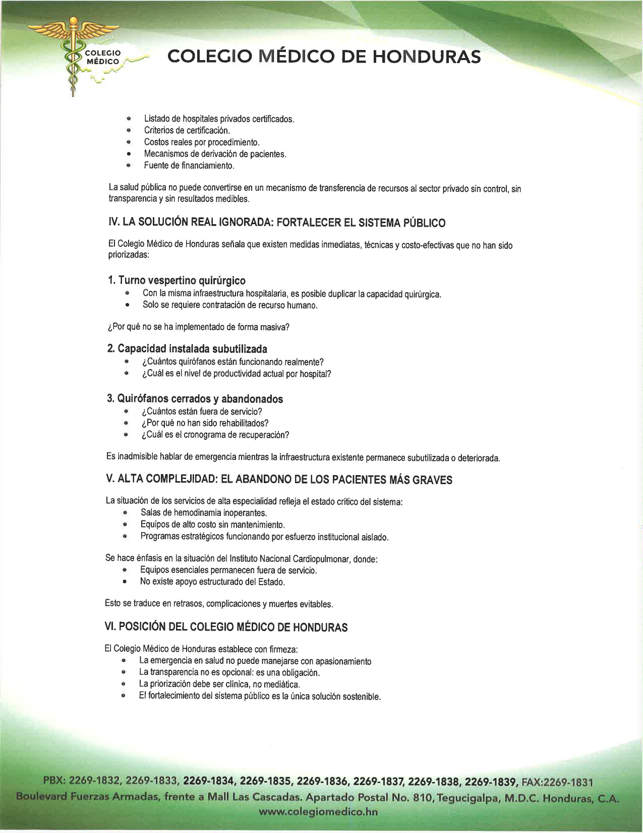 El Colegio también cuestionó la propuesta de derivar pacientes al sector privado como parte de la solución, advirtiendo que podría convertirse en una transferencia de recursos sin control ni resultados medibles. Por ello, demandó claridad en los criterios de certificación de hospitales, costos por procedimiento y mecanismos de financiamiento.