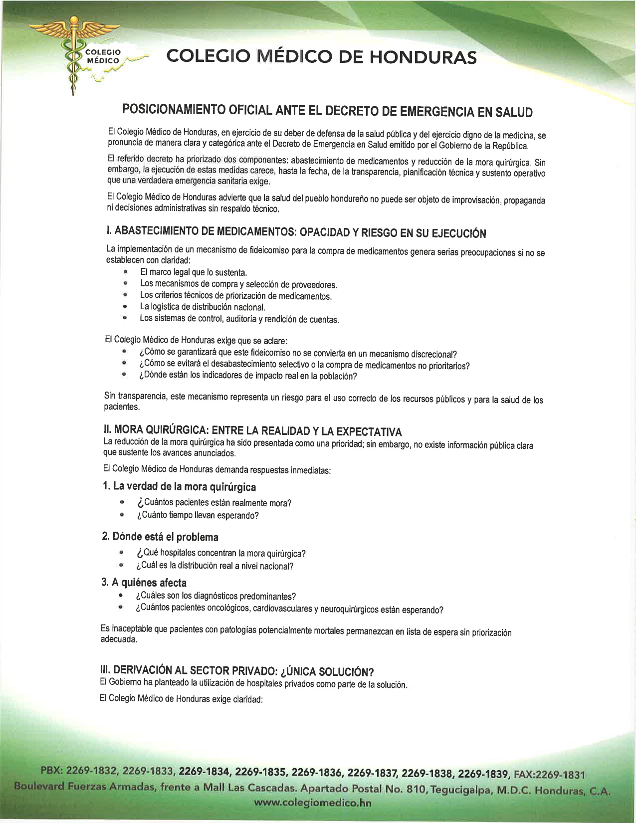 Tegucigalpa. El Colegio Médico de Honduras (CMH) emitió un posicionamiento crítico frente al decreto de emergencia en salud impulsado por el Gobierno, advirtiendo que las medidas carecen de transparencia, planificación técnica y sustento operativo, lo que —a su juicio— pone en riesgo la correcta atención de la población.