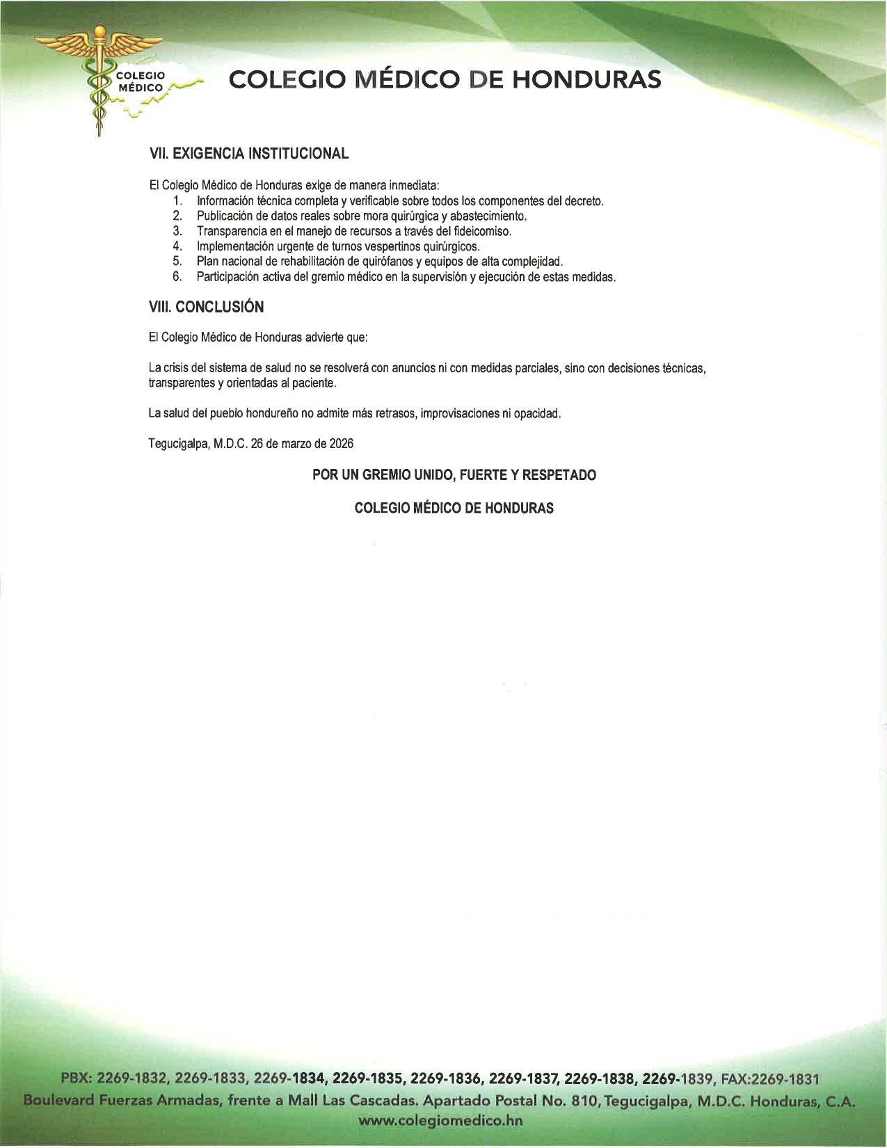 Finalmente, el CMH exigió al Gobierno información técnica verificable, transparencia en el manejo de recursos y la implementación inmediata de medidas estructurales. “La crisis del sistema de salud no se resolverá con anuncios ni medidas parciales, sino con decisiones técnicas, transparentes y orientadas al paciente”, concluyó el organismo.