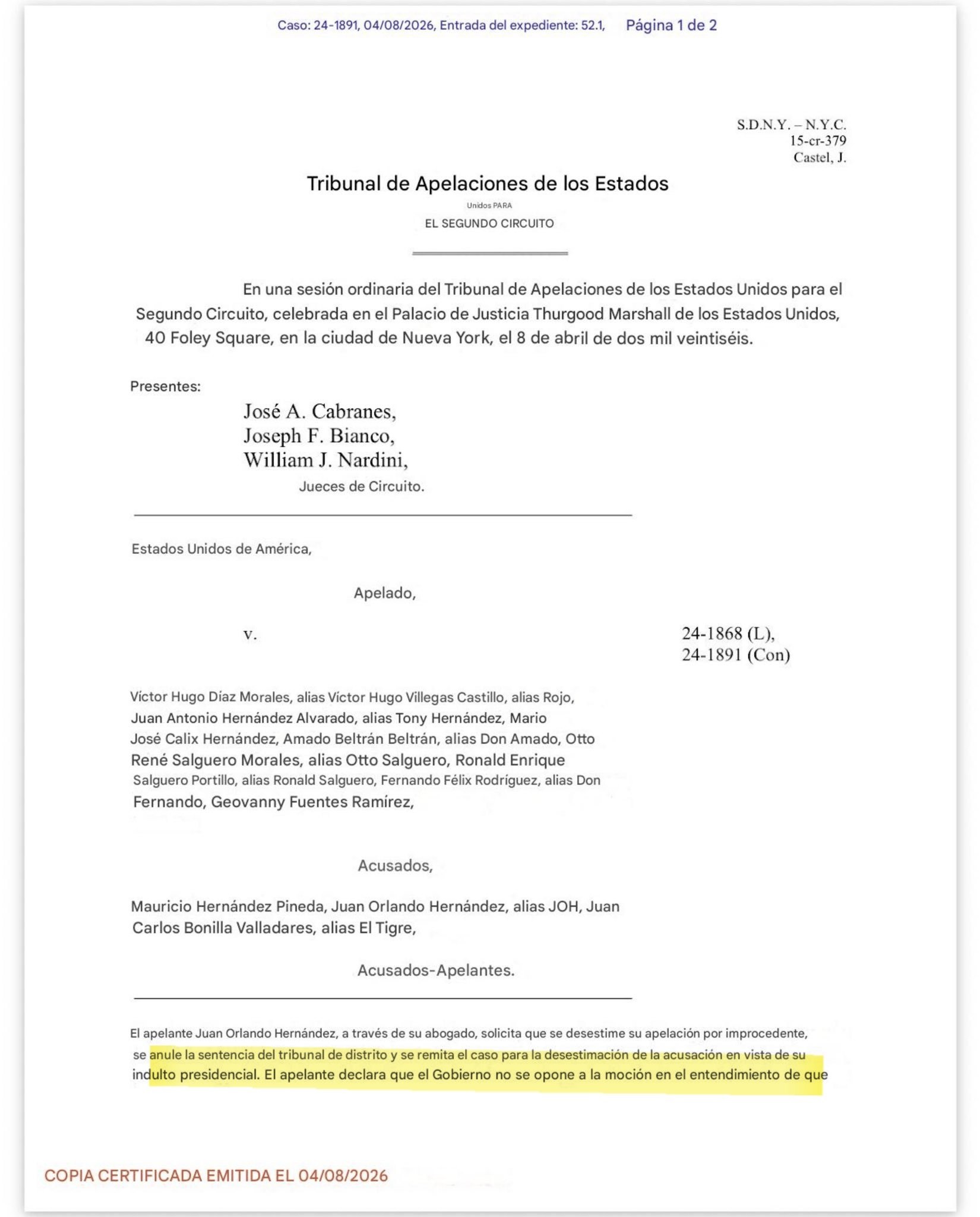 La resolución de la Corte de Apelaciones de Nueva York cerró el proceso contra Juan Orlando Hernández; sin embargo, no revisó las pruebas ni modificó el veredicto emitido por el jurado, ya que el caso fue desestimado tras el indulto presidencial; es decir, fue declarado culpable, aunque hoy no enfrenta una condena vigente.
