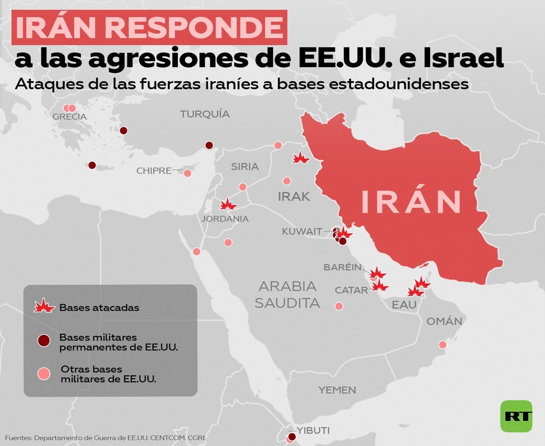 Los ataques contra bases aéreas estadounidenses buscan reducir la capacidad de Estados Unidos para realizar operaciones contra Irán y obligar a sus fuerzas a operar desde ubicaciones más lejanas. Las represalias iraníes también se centraron en radares y sistemas de defensa antimisiles, incluidas instalaciones vinculadas a THAAD y radares de alerta temprana en la región. Concluye el articulo publicado por la agencia de medios internacional, RT.